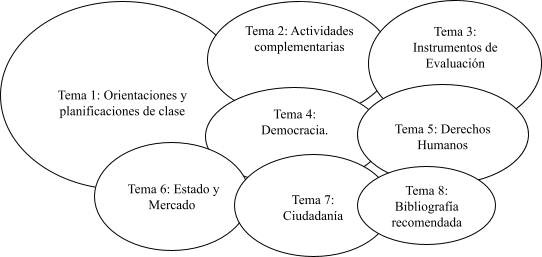Para graficar lo anterior, en la Figura 1 se pueden observar los temas presentes en la Guía Didáctica del Docente de Educación Ciudadana representados por una elipse. En la Figura 2 se presentan los temas de las entrevistas al profesorado participante. La enumeración que reciben corresponde a su orden de aparición en el texto y su tamaño se relaciona con su recurrencia en el texto.