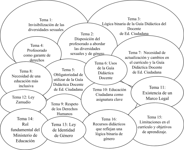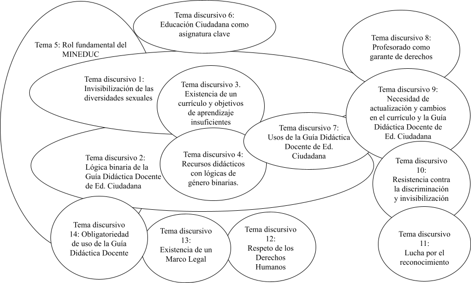 A continuación, la Figura 3 muestra el discurso sobre las diversidades sexuales y de género en la Guía Didáctica del Docente de Educación Ciudadana y en las entrevistas del profesorado participante. En ella se grafican las relaciones existentes entre los ámbitos de acción y de control, las variedades discursivas y los temas. En la primera parte, se pueden ver las distintas variedades discursivas agrupadas en los diferentes ámbitos de acción o de control. En la segunda parte, se grafica la recurrencia de los temas discursivos a través del tamaño de las elipses y se visualiza la forma en que estos se relacionan entre sí a través de la superposición de una elipse sobre otra.