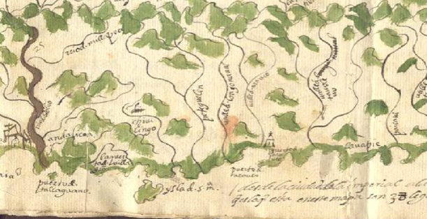 […]llegado, pues, al río de Biobío, pasó su campo por una barca. Puesto de la otra parte con muchos indios que llevaba por amigos de los repartimientos que estaban de paz, llevando su maestro de campo el avanguardia, llegó a un valle que se llama Andalicán. Haciendo allí dormida […]Otro día luego partió el campo de Andalicán y llegó a otro valle que se llama Chivilingo[…] (Góngora Marmolejo, 1574; 193)