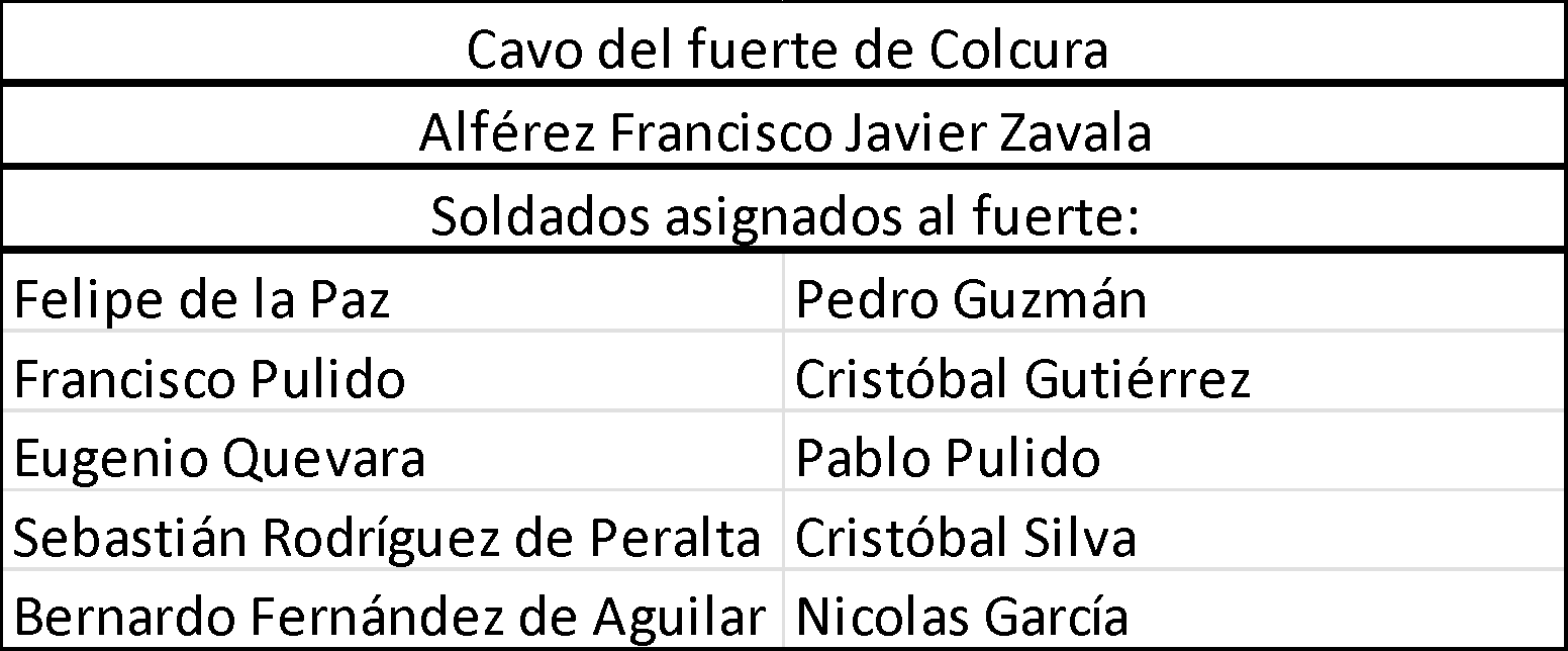 El mismo informe muestra que el fuerte de Colcura estaba bajo el mando del alférez Javier Zavala y mantenía una guarnición de 10 soldados.