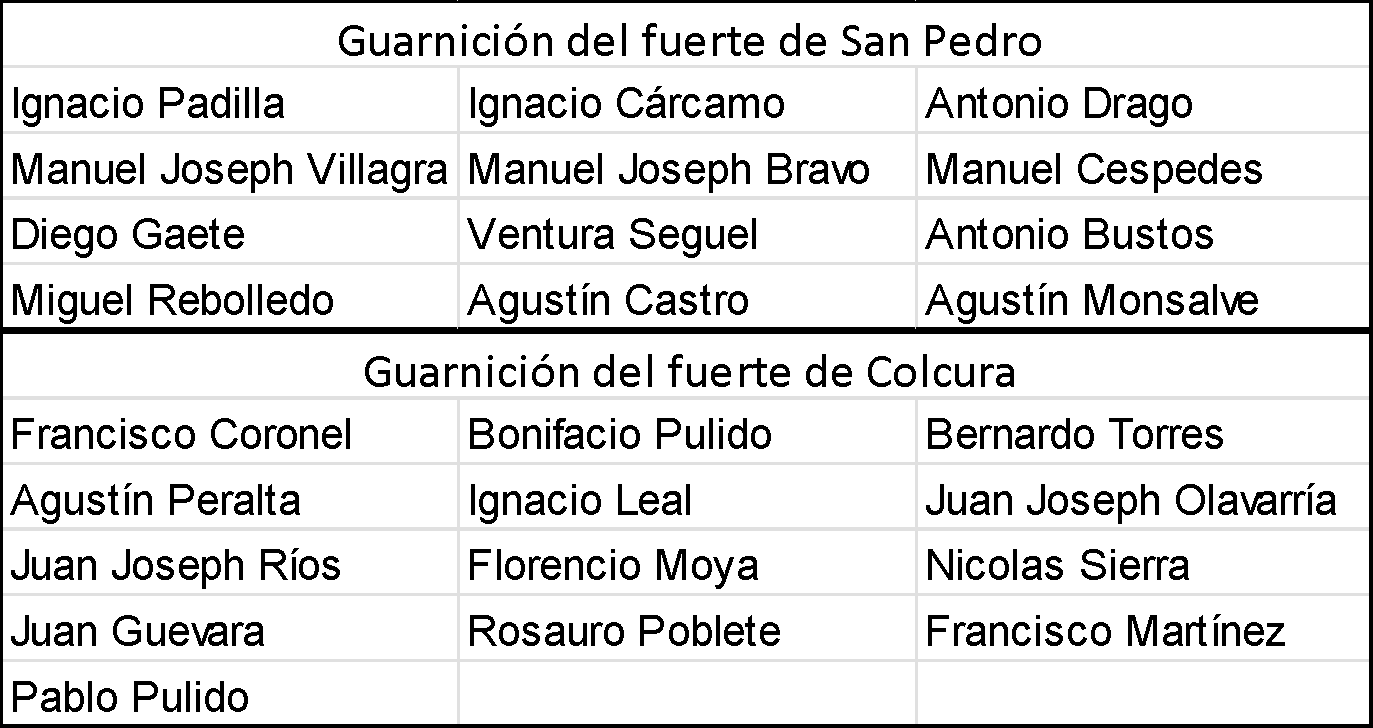 Ilustración 6 Guarniciones de los fuertes de San Pedro y Colcura, año 1764