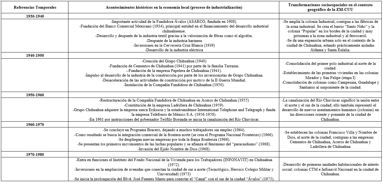 En este punto es necesario especificar los alcances cronológicos que la matriz geohistórica ha de considerar en el análisis geohistórico. De esta forma, la integración de la misma estará contemplando un periodo que abarca desde el año de 1930 al año 2000. Este periodo de 70 años, será segmentado en dos partes: a) primer periodo: 1930-1982; b) segundo periodo: 1983-2000.