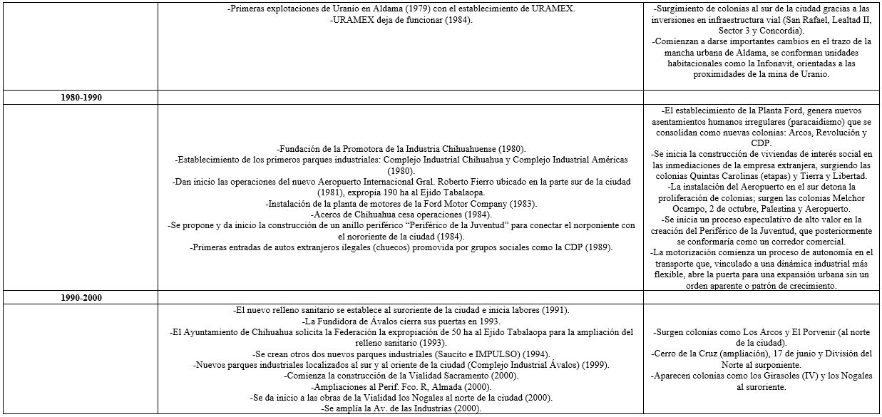 Es así como la motorización puede considerarse un elemento clave en la conformación de las primeras conurbaciones entre Aquiles Serdán y Chihuahua, posteriormente entre Chihuahua y Aldama; la facilidad de transportarse a mayores distancias de una forma autónoma, así como las importantes inversiones en materia de vialidades (avenidas, bulevares y periféricos), aunado a una mayor libertad de las empresas extranjeras en cuanto a su localización, definitivamente favoreció la expansión de la mancha urbana para perfilarla en una pequeña área metropolitana[63].